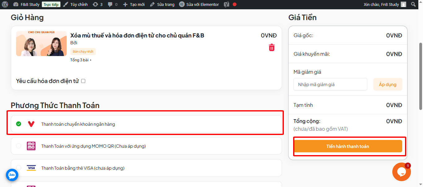 - Kiểm tra giỏ hàng – nếu học phí hiển thị là 0đ, lựa chọn phương thức “Thanh toán chuyển khoản ngân hàng” và nhấn “Tiến hành thanh toán”